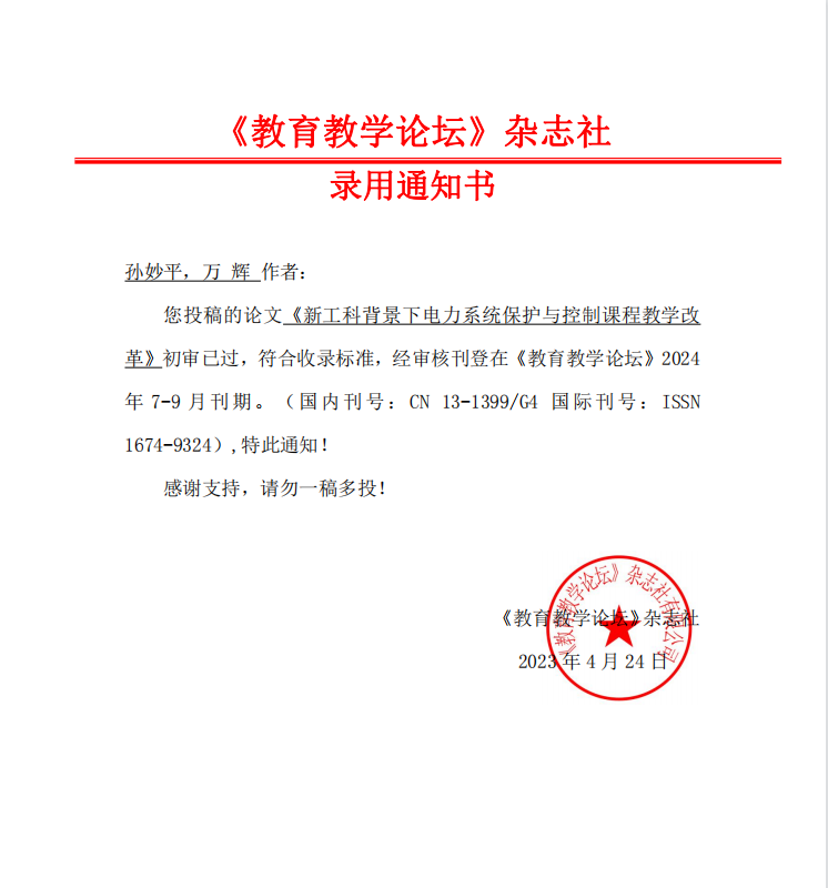 孙妙平,万 辉 《新工科背景下电力系统保护与控制课程教学改革》 录用通知