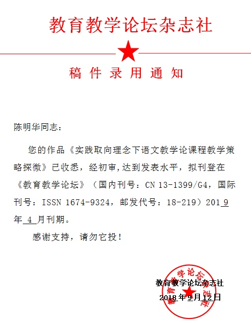 陈明华 --- 《 实践取向理念下语文教学论课程教学策略探微 》录稿通知