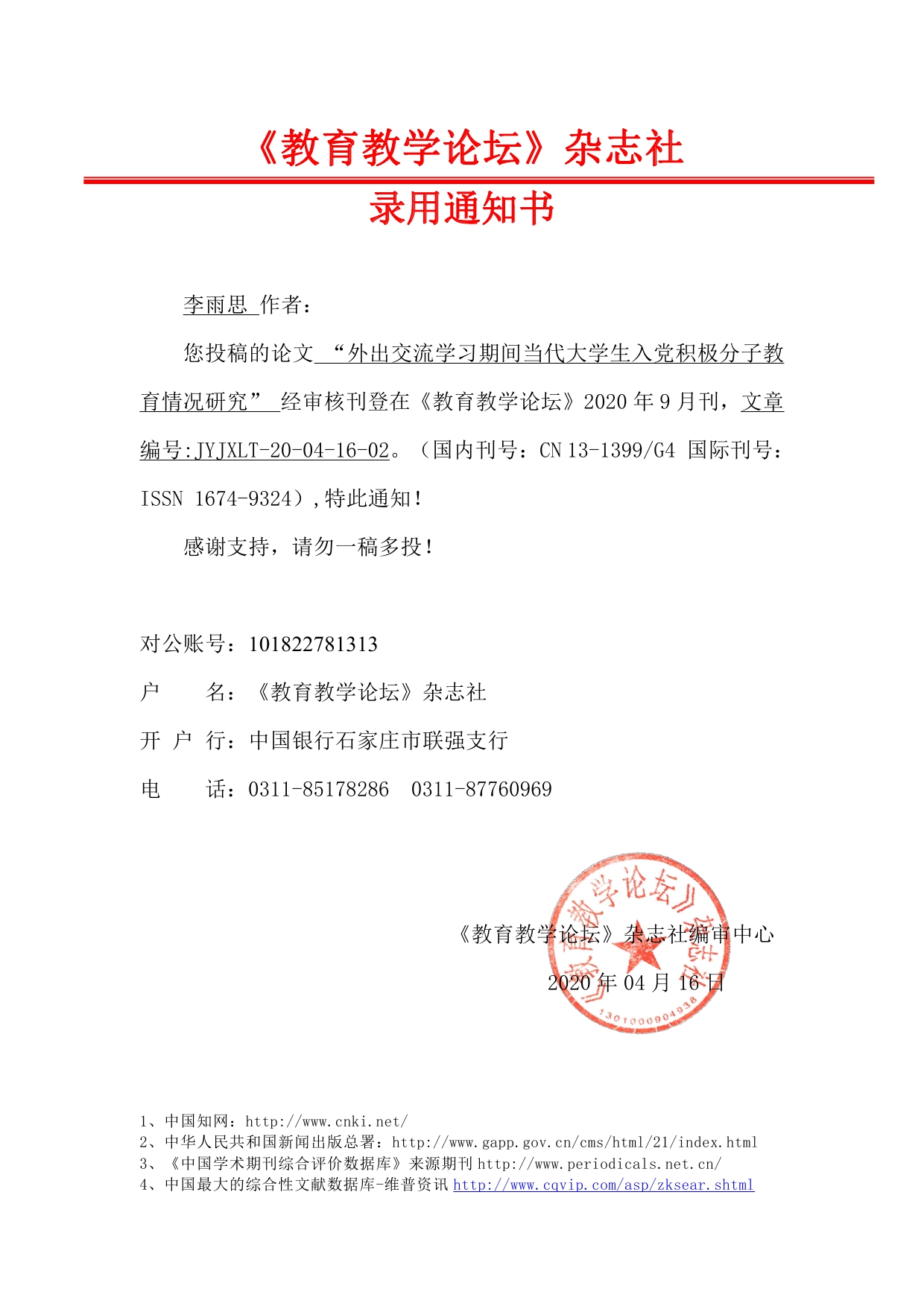 您投稿的论文“外出交流学习期间当代大学生入党积极分子教育情况研究”经审核刊登在《教育教学论坛》2020年9月刊,文章编号:JYJXLT-20-04-16-02。(国内刊号:CN13-1399/G4 国际刊号:ISSN1674-9324),特此通知!