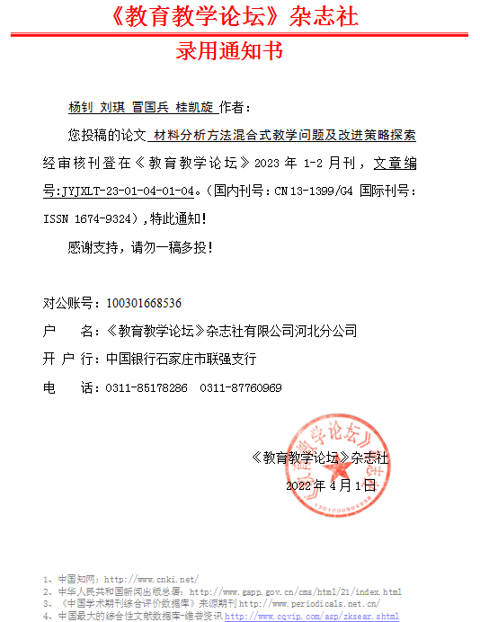 杨钊,刘琪,冒国兵,桂凯旋+材料分析方法混合式教学问题及改进策略探索 录用通知