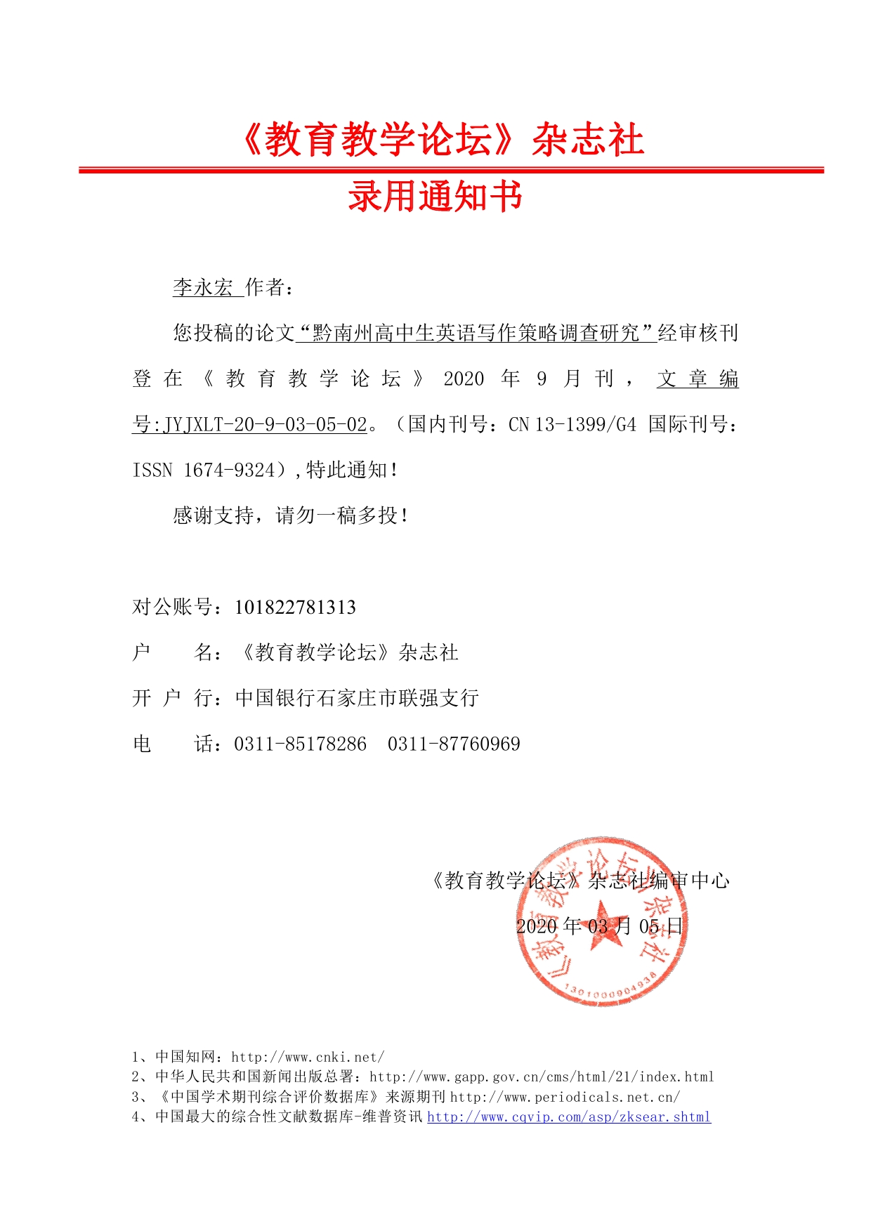 您投稿的论文“黔南州高中生英语写作策略调查研究”经审核刊登在《教育教学论坛》2020年9月刊,文章编号:JYJXLT-20-9-03-05-02。(国内刊号:CN13-1399/G4 国际刊号:ISSN1674-9324),特此通知!