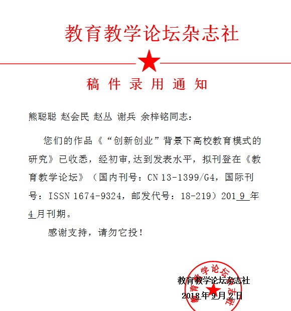熊聪聪 ---《“创新创业”背景下高校教育模式的研究》录稿通知