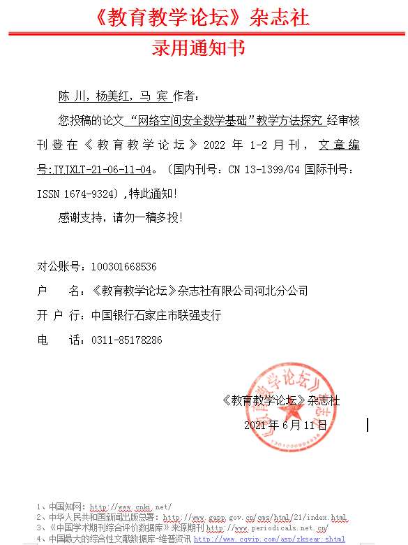 陈 川,杨美红,马 宾+“网络空间安全数学基础”教学方法探究 录用通知