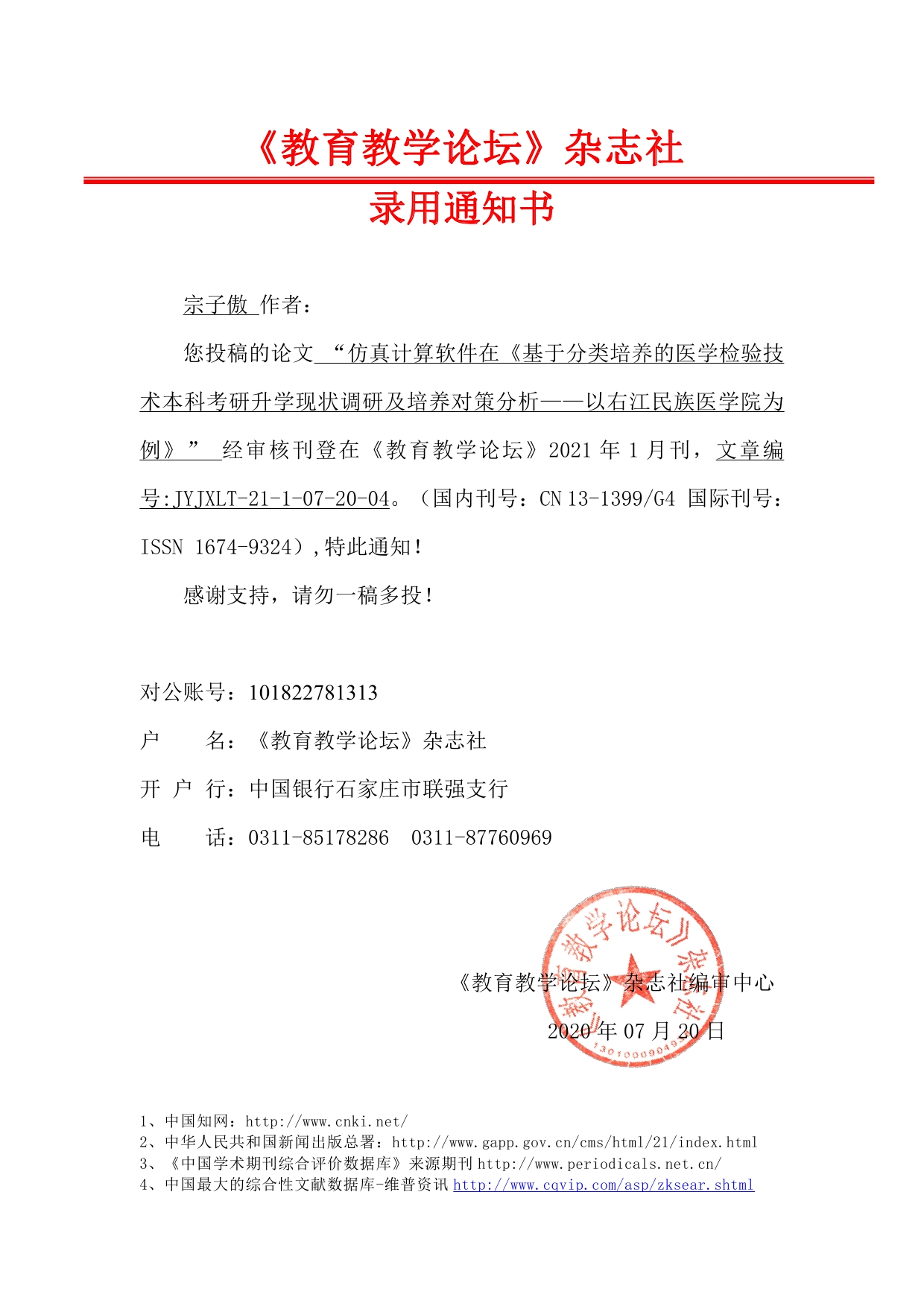 《教育教学论坛》杂志社 录用通知书——宗子傲