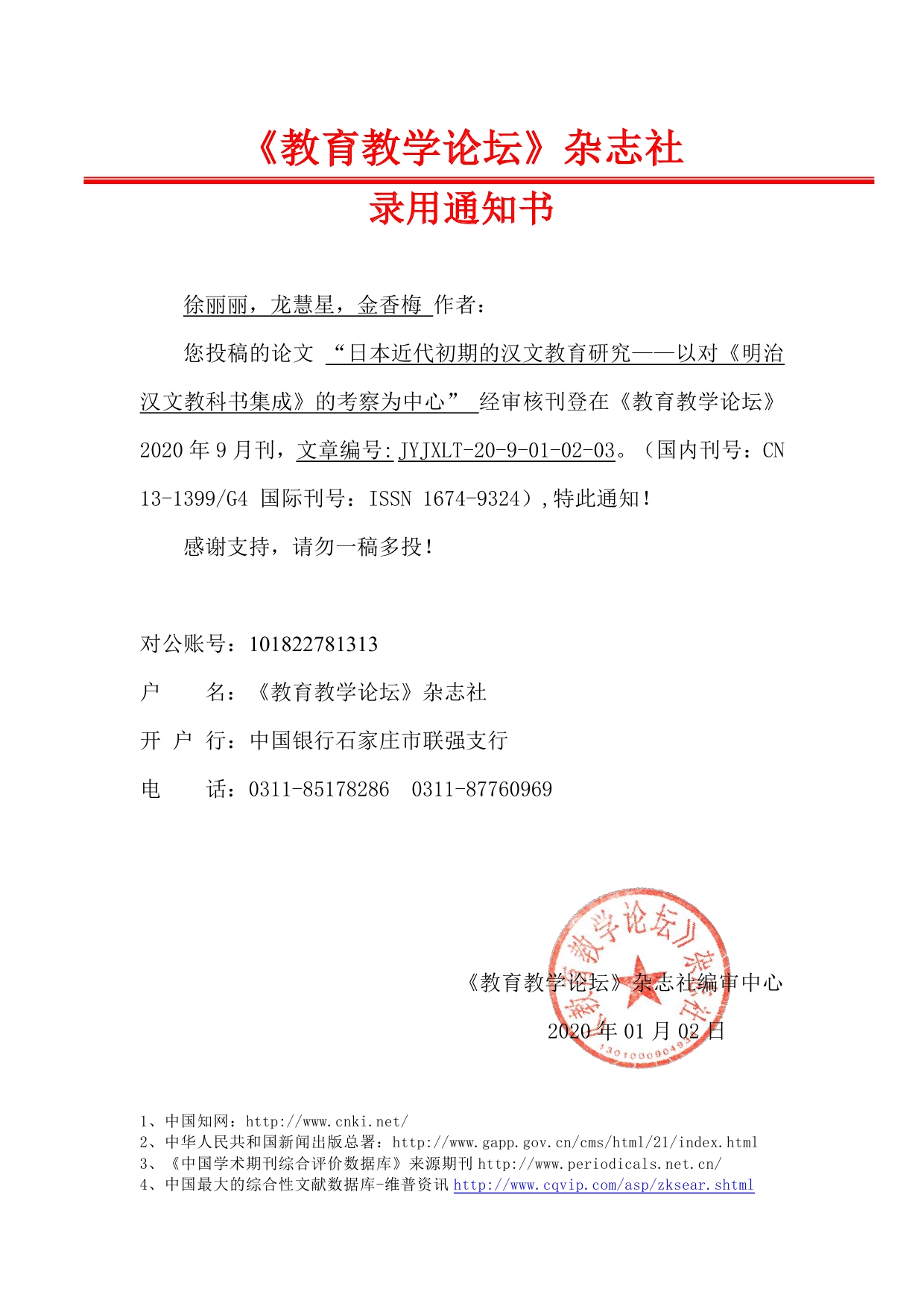 作者:您投稿的论文“日本近代初期的汉文教育研究——以对《明治汉文教科书集成》的考察为中心”经审核刊登在《教育教学论坛》2020年9月刊,文章编号:JYJXLT-20-9-01-02-03。(国内刊号:CN13-1399/G4 国际刊号:ISSN 1674-9324),特此通知!