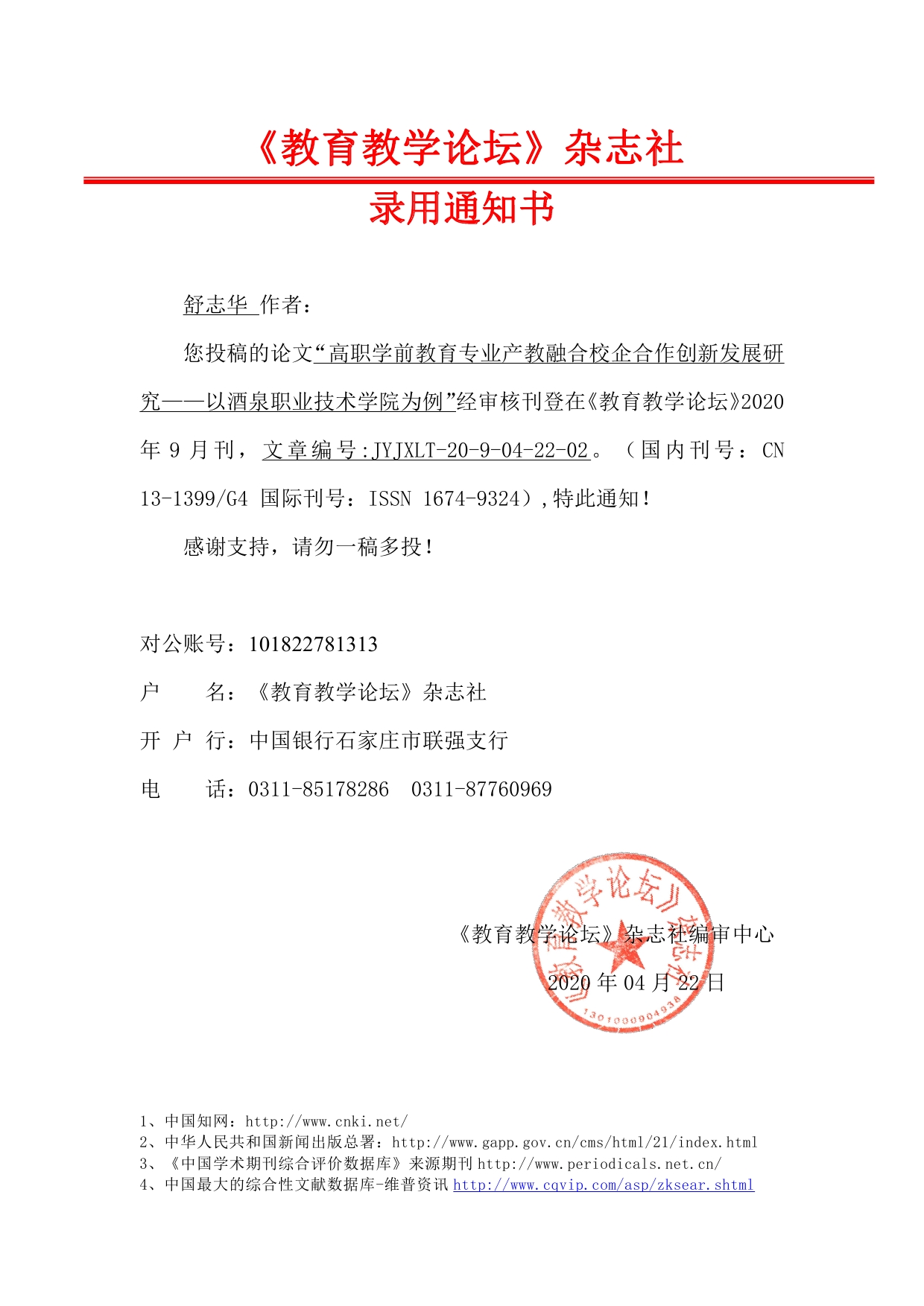 作者:您投稿的论文“高职学前教育专业产教融合校企合作创新发展研究——以酒泉职业技术学院为例”经审核刊登在《教育教学论坛》2020年9月刊,文章编号:JYJXLT-20-9-04-22-02。(国内刊号:CN13-1399/G4 国际刊号:ISSN 1674-9324),特此通知!