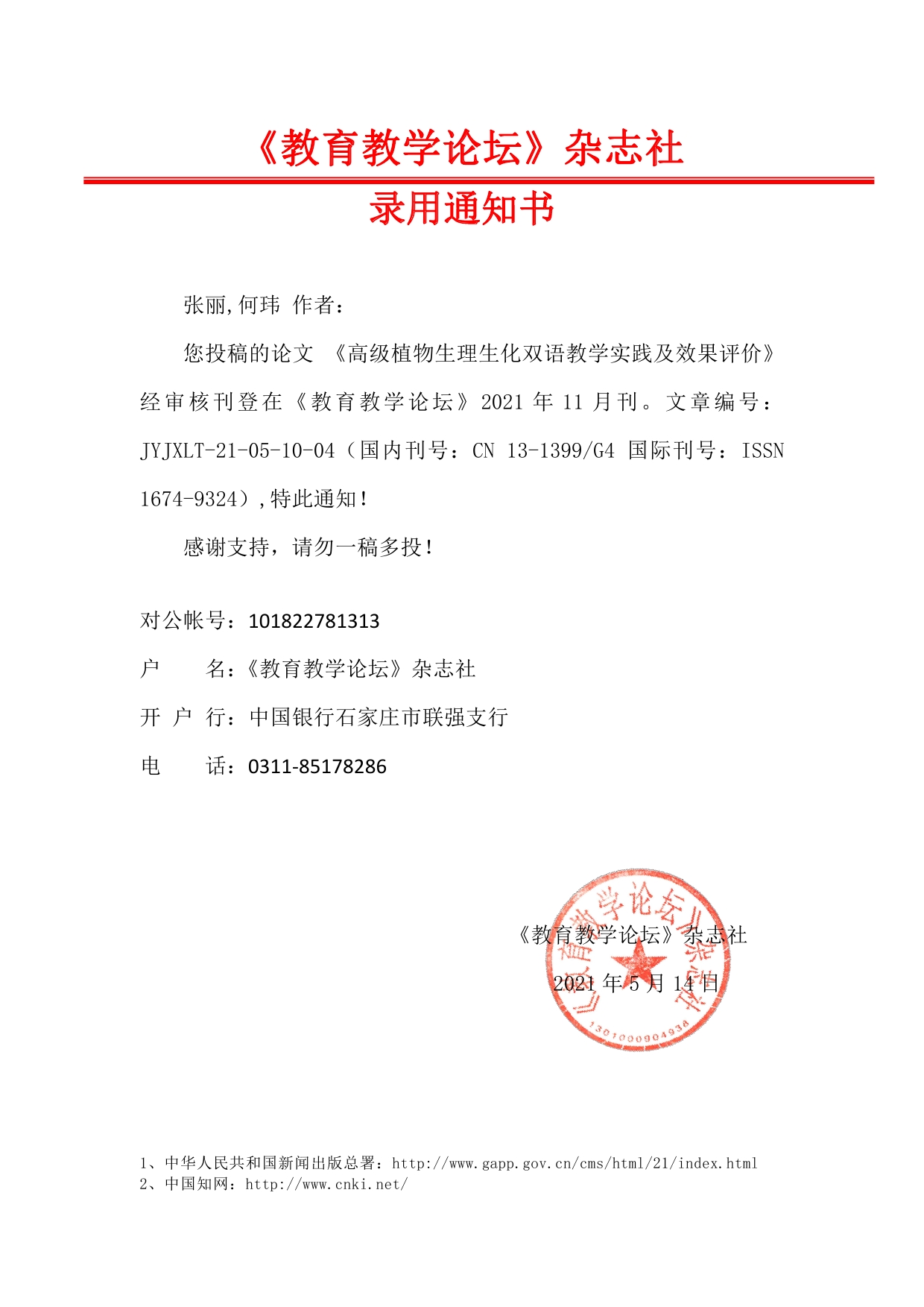 您投稿的论文 《高级植物生理生化双语教学实践及效果评价》 经审核刊登在《教育教学论坛》2021 年 11 月刊。文章编号: JYJXLT-21-05-10-04(国内刊号:CN 13-1399/G4 国际刊号:ISSN 1674-9324),特此通知!