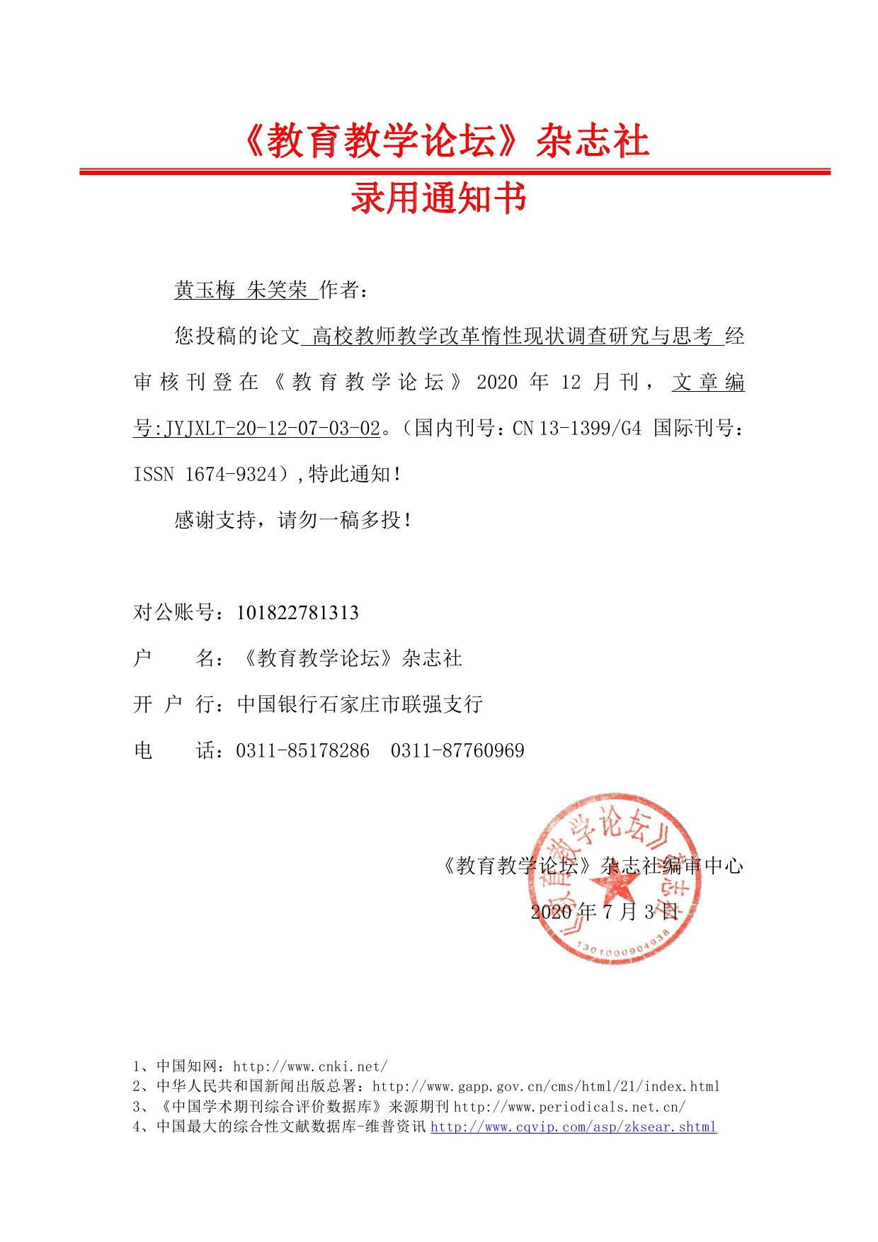 您投稿的论文高校教师教学改革惰性现状调查研究与思考经审核刊登在《教育教学论坛》2020年12月刊,文章编号:JYJXLT-20-12-07-03-02。(国内刊号:CN13-1399/G4 国际刊号:ISSN1674-9324),特此通知!