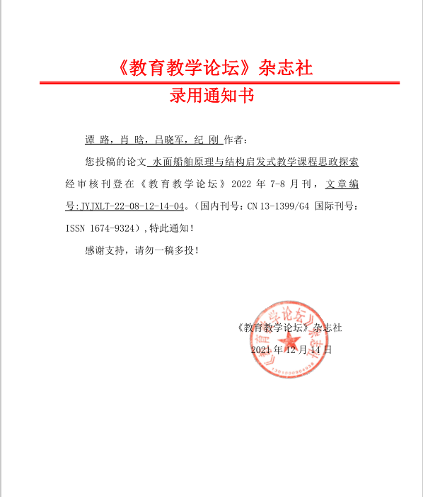 谭 路,肖 晗,吕晓军,纪 刚+水面船舶原理与结构启发式教学课程思政探索 录用通知