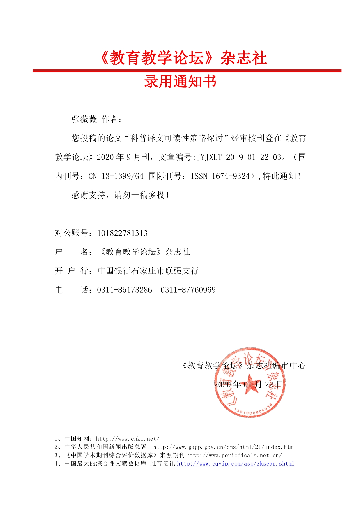作者:您投稿的论文“科普译文可读性策略探讨”经审核刊登在《教育教学论坛》2020年9月刊,文章编号:JYJXLT-20-9-01-22-03。(国内刊号:CN13-1399/G4 国际刊号:ISSN 1674-9324),特此通知!