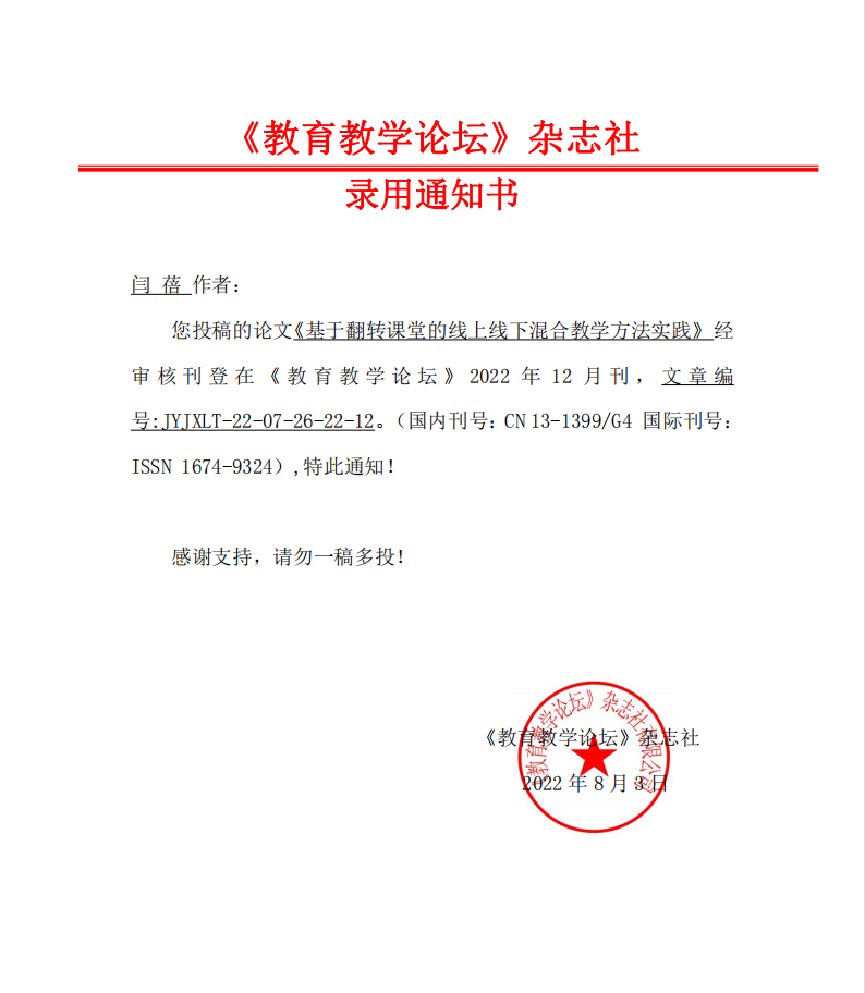 闫蓓 基于翻转课堂的线上线下混合教学方法实践 录用通知