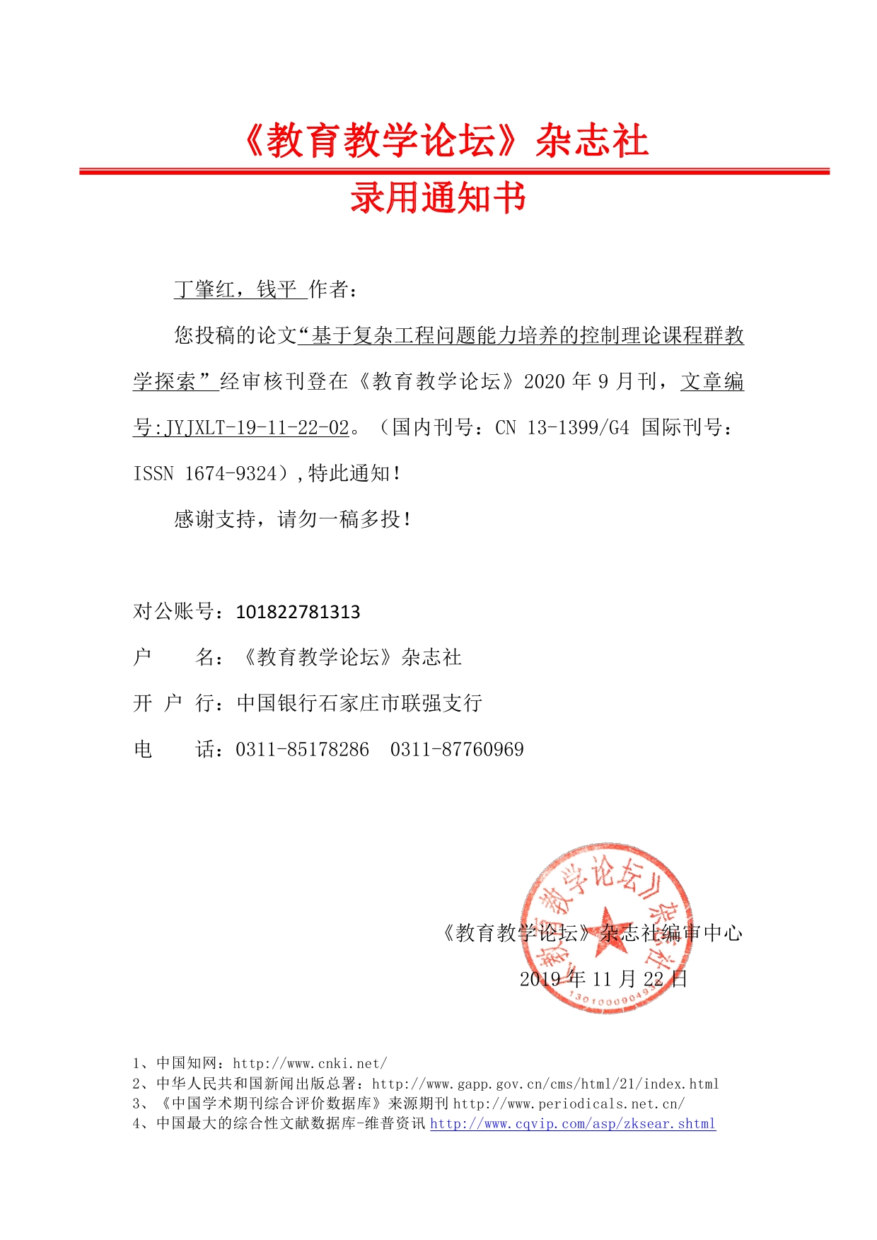 您投稿的论文“基于复杂工程问题能力培养的控制理论课程群教学探索”经审核刊登在《教育教学论坛》2020年9月刊,文章编号:JYJXLT-19-11-22-02。(国内刊号:CN13-1399/G4 国际刊号:ISSN1674-9324),特此通知!