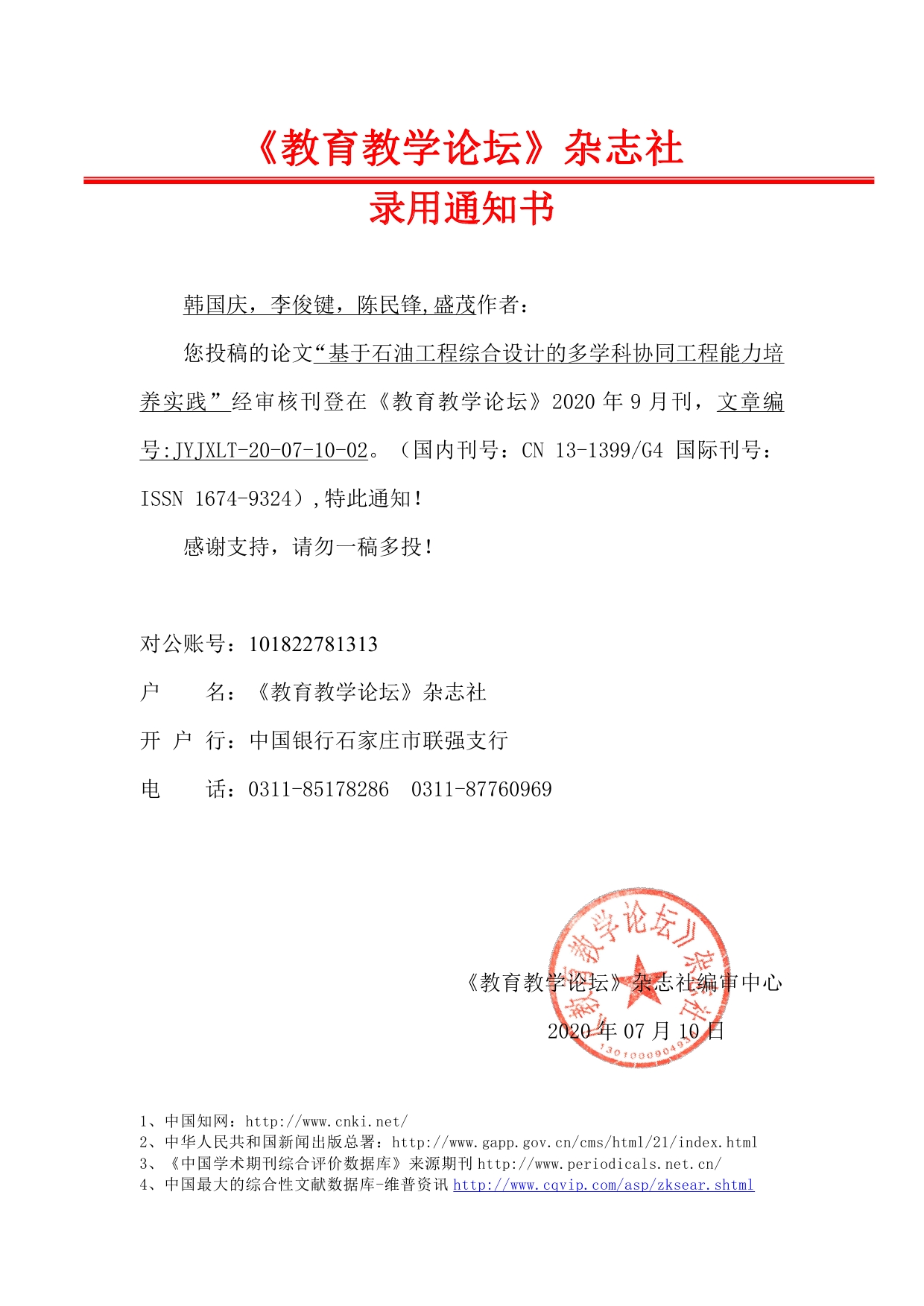 《教育教学论坛》杂志社 录用通知书——韩国庆,李俊键,陈民锋,盛茂