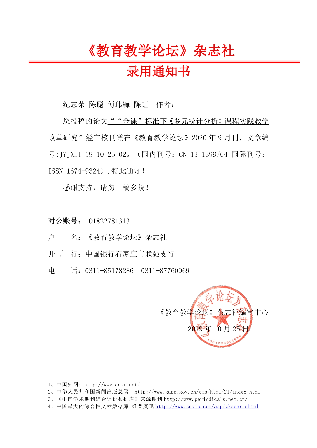 您投稿的论文““金课”标准下《多元统计分析》课程实践教学改革研究”经审核刊登在《教育教学论坛》2020年9月刊,文章编号:JYJXLT-19-10-25-02。(国内刊号:CN13-1399/G4 国际刊号:ISSN1674-9324),特此通知!