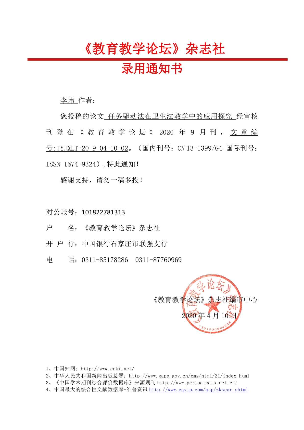 作者:您投稿的论文任务驱动法在卫生法教学中的应用探究经审核刊登在《教育教学论坛》2020年9月刊,文章编号:JYJXLT-20-9-04-10-02。(国内刊号:CN13-1399/G4 国际刊号: ISSN 1674-9324),特此通知!