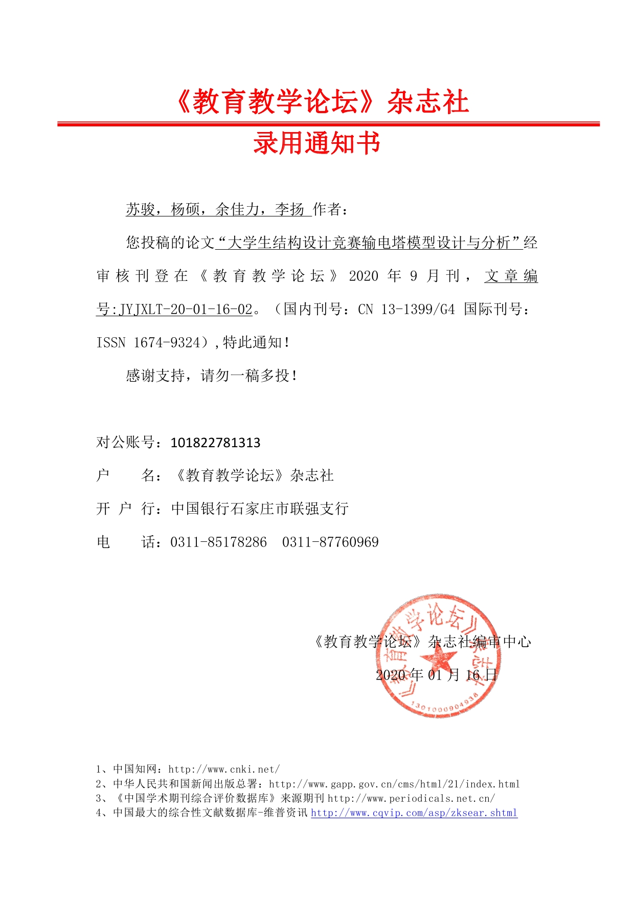 《教育教学论坛》杂志社 录用通知书——苏骏,杨硕,余佳力,李扬