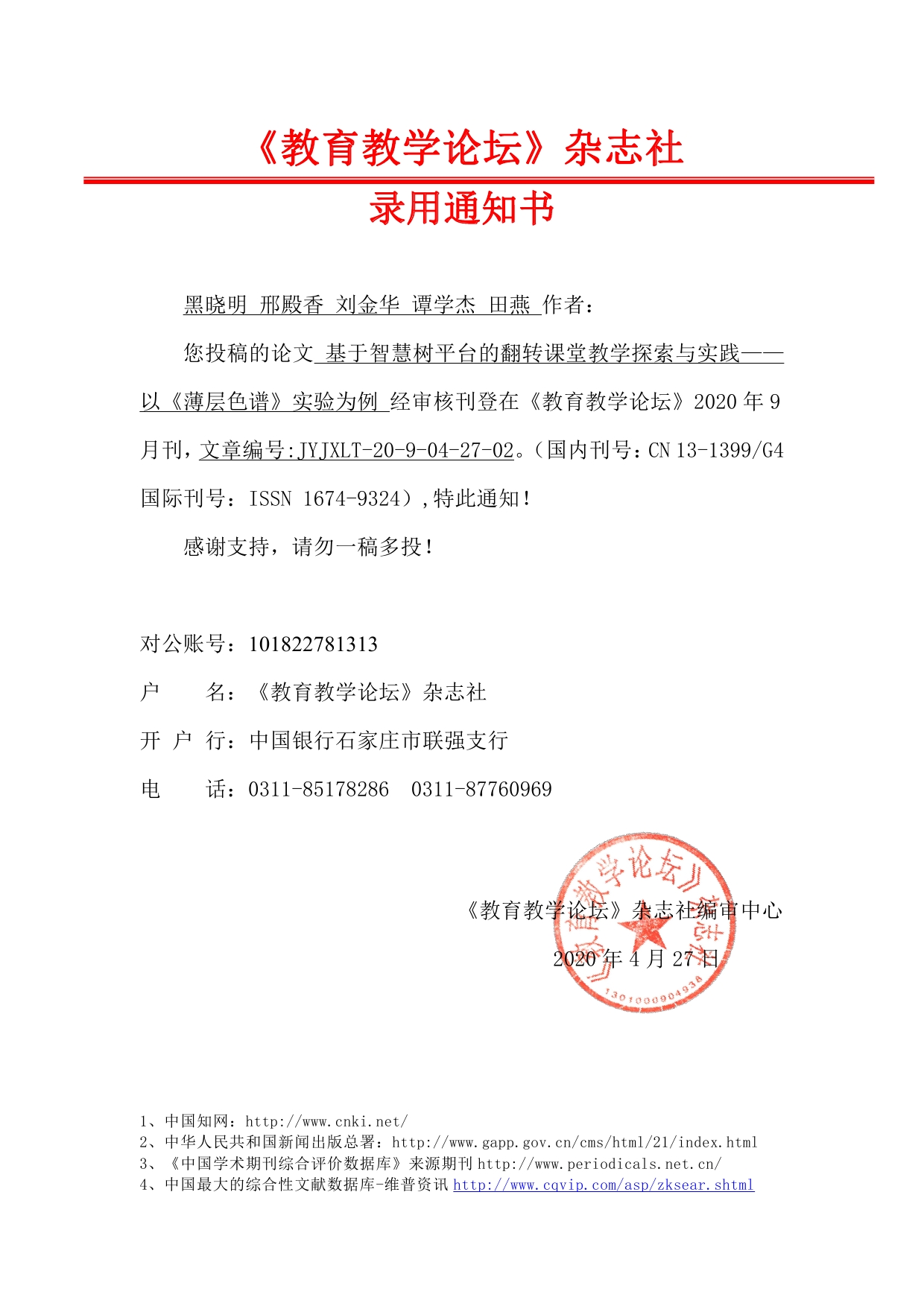 《教育教学论坛》杂志社 录用通知书——黑晓明 邢殿香 刘金华 谭学杰 田燕