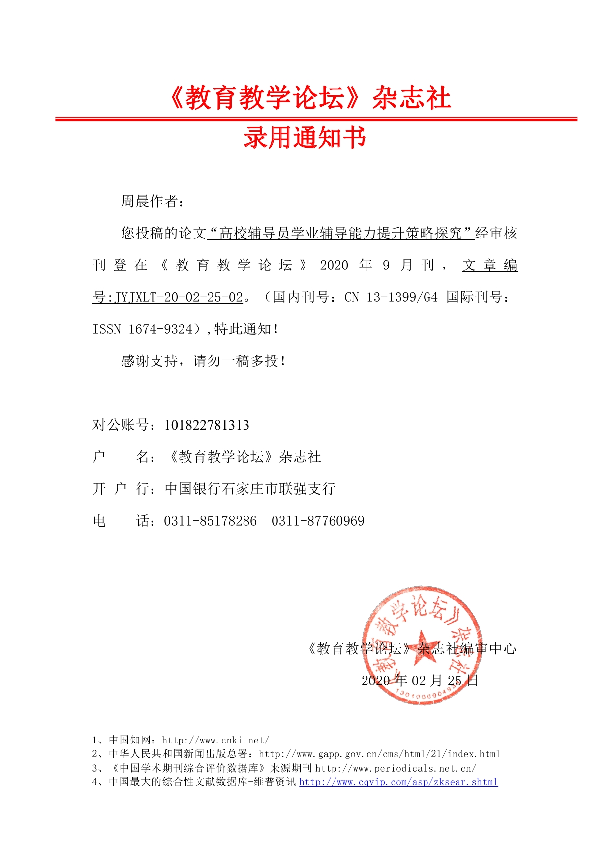 - 下一篇:《教育教学论坛》杂志社 录用通知书——周泓,黄正行,杨扬,齐 2021/6/4