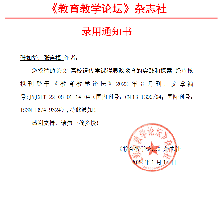 张如华,张连梅+高校遗传学课程思政教育的实践和探索 录用通知