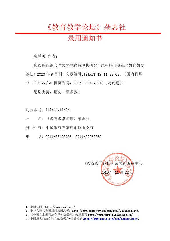 您投稿的论文“大学生感戴现状研究”经审核刊登在《教育教学论坛》2020 年 9 月刊,文章编号:JYJXLT-19-11-22-02。(国内刊号:CN 13-1399/G4 国际刊号:ISSN 1674-9324),特此通知!