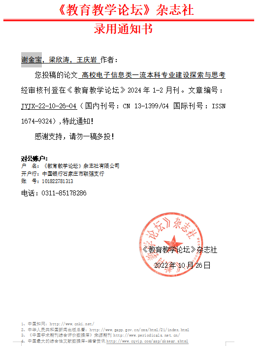谢金宝,梁欣涛,王庆岩+高校电子信息类一流本科专业建设探索与思考 录用通知