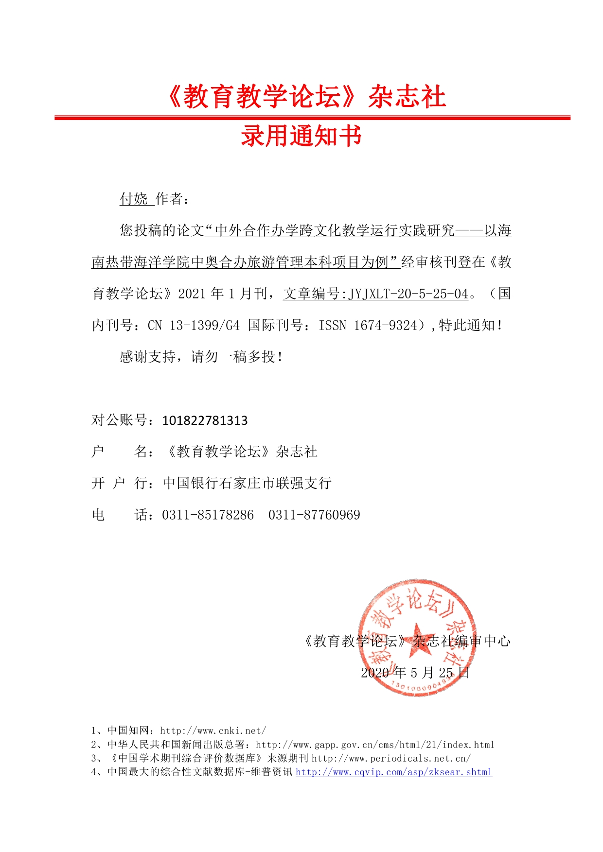 《教育教学论坛》杂志社 录用通知书——付娆