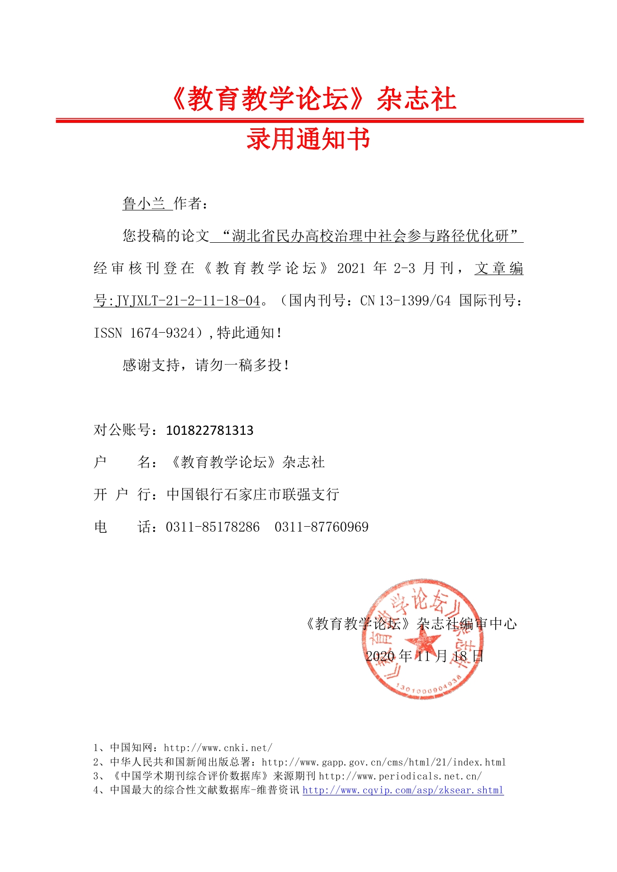 作者:您投稿的论文“湖北省民办高校治理中社会参与路径优化研”经审核刊登在《教育教学论坛》2021年2-3月刊,文章编号:JYJXLT-21-2-11-18-04。(国内刊号:CN13-1399/G4 国际刊号: ISSN 1674-9324),特此通知!