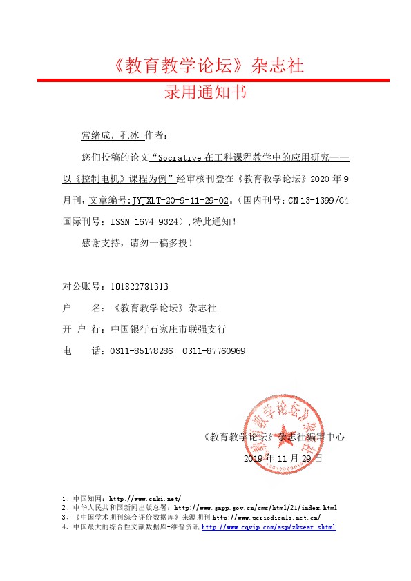 您们投稿的论文“Socrative在工科课程教学中的应用研究——以《控制电机》课程为例”经审核刊登在《教育教学论坛》2020年9月刊,文章编号:JYJXLT-20-9-11-29-02。(国内刊号:CN13-1399/G4国际刊号:ISSN1674-9324),特此通知!