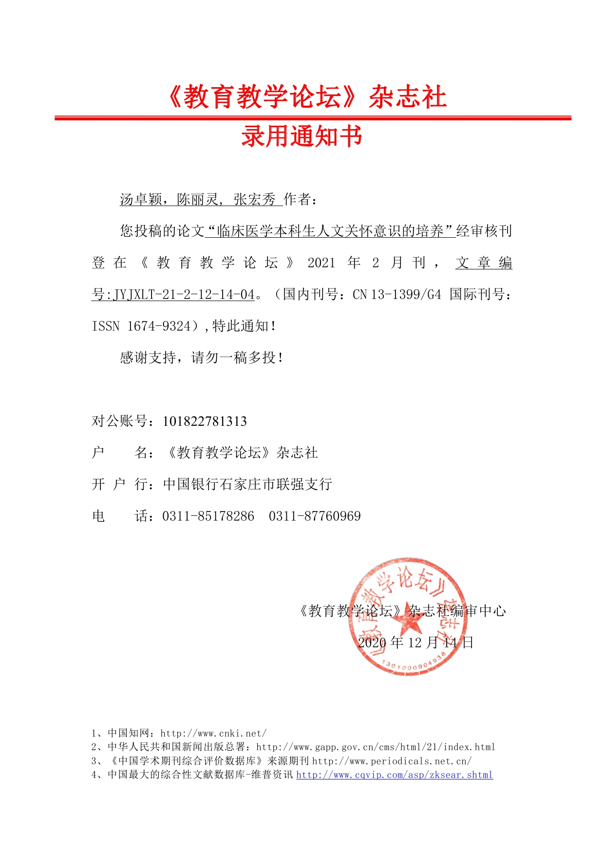 作者:您投稿的论文“临床医学本科生人文关怀意识的培养”经审核刊登在《教育教学论坛》2021年2月刊,文章编号:JYJXLT-21-2-12-14-04。(国内刊号:CN13-1399/G4 国际刊号: ISSN 1674-9324),特此通知!